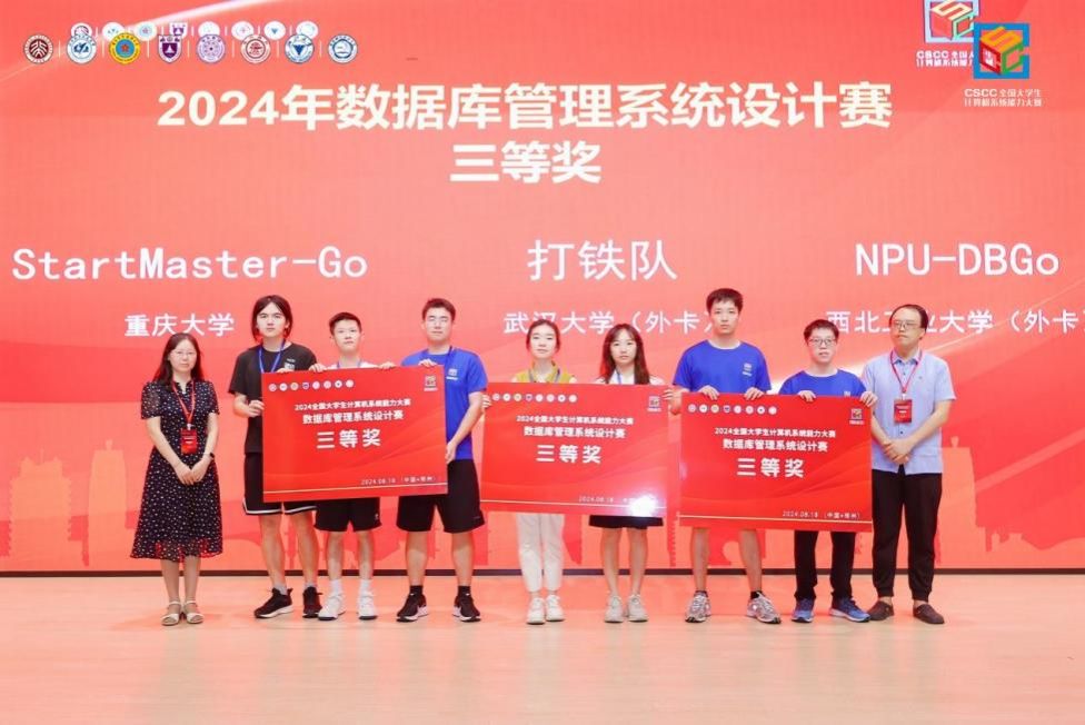 数据库团队多位老师的指导下不断优化代码、调整算法,克服了一个又一个技术难题,最终脱颖而出,完成了一个可以运行TPC-C基准测试的小型数据库管理系统。其中,由沈阳、丁榕、张凯伦三位同学组成的“啊对对队”,以及由甘仰发、曾庆礼、王旭升三位同学组成的“对什么队”同时荣获二等奖,由白博昊、郑泽锴、杨黎健同学组成的“NPU-DBGo”队伍荣获三等奖。