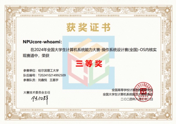 张瀚宸组成的“NPUcore-IMPACT!!!”队伍获得LoongArch内核实现赛道一等奖。该队伍的NPUcore-IMPACT内核使用Rust编写,基于龙芯架构支持2K1000开发板及其虚拟机,支持106个系统调用和FAT32/EXT4文件系统,并在初赛决赛取得最高分,成为该赛道唯一libc-bench得分队伍。