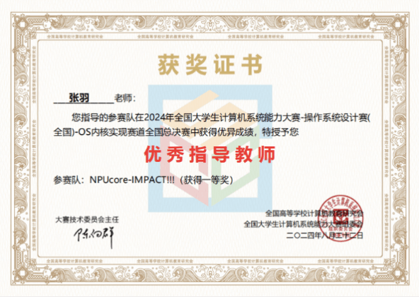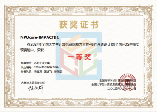 张瀚宸组成的“NPUcore-IMPACT!!!”队获得内核实现(基于国产龙芯LoongArch硬件)赛道一等奖(全国冠军)。该队设计和开发的NPUcore-IMPACT(银派核)操作系统内核基于Rust语言编写,可在基于国产龙芯架构的2K1000开发板及其虚拟机上稳定运行。银派核不仅支持106个系统调用和FAT32/EXT4文件系统,还根据龙芯LLVM架构提出了NPUcore-lwext4版EXT4文件crate包,首次针对龙芯2K1000开发板的SCSI方法上板成功,成为该赛道全国唯一libc-bench得分队伍,初赛和总决赛均取得全国最高分。