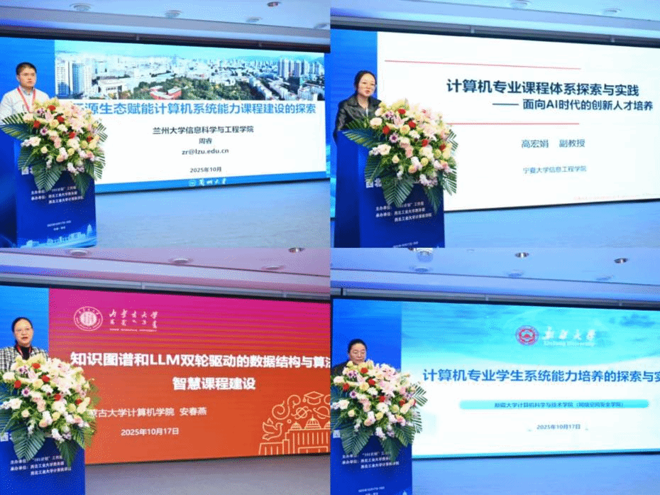 王党辉教授主持。兰州大学周睿、宁夏大学高宏娟、内蒙古大学安春燕、新疆大学盛琪分别分享了所在学校的课程建设和AI实践探索情况。
