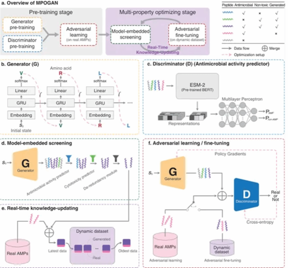 抗菌肽(AMP)是一类具有抗菌活性的小分子多肽药物,由于其广谱抗菌特性且不易诱导细菌产生耐药性,AMP成为应对全球细菌耐药性问题的重要研究方向。然而,AMP从头设计领域目前仍面临诸多挑战。实验室合成AMP的过程耗时且成本高昂;且抗菌肽不同属性之间可能存在冲突,使得现有计算方法难以同时优化多种目标特性(如抗菌活性、低毒性和序列多样性等)。为了解决这些挑战,该论文提出了面向抗菌肽多属性同步优化的生成对抗网络(MPOGAN)。通过设计嵌入式和串联式的属性评估器,筛选生成模型生成的高质量肽序列,并提出实时知识更新(RTKU)策略,动态更新训练数据集,从而迭代学习肽序列与多种治疗属性之间的关系,使生成模型逐渐具备生成具有多种优良属抗菌肽的能力。实验结果表明,MPOGAN在生成满足多种目标属性(高抗菌活性、低毒性和序列多样性)的抗菌肽方面优于现有方法。通过与日韩av