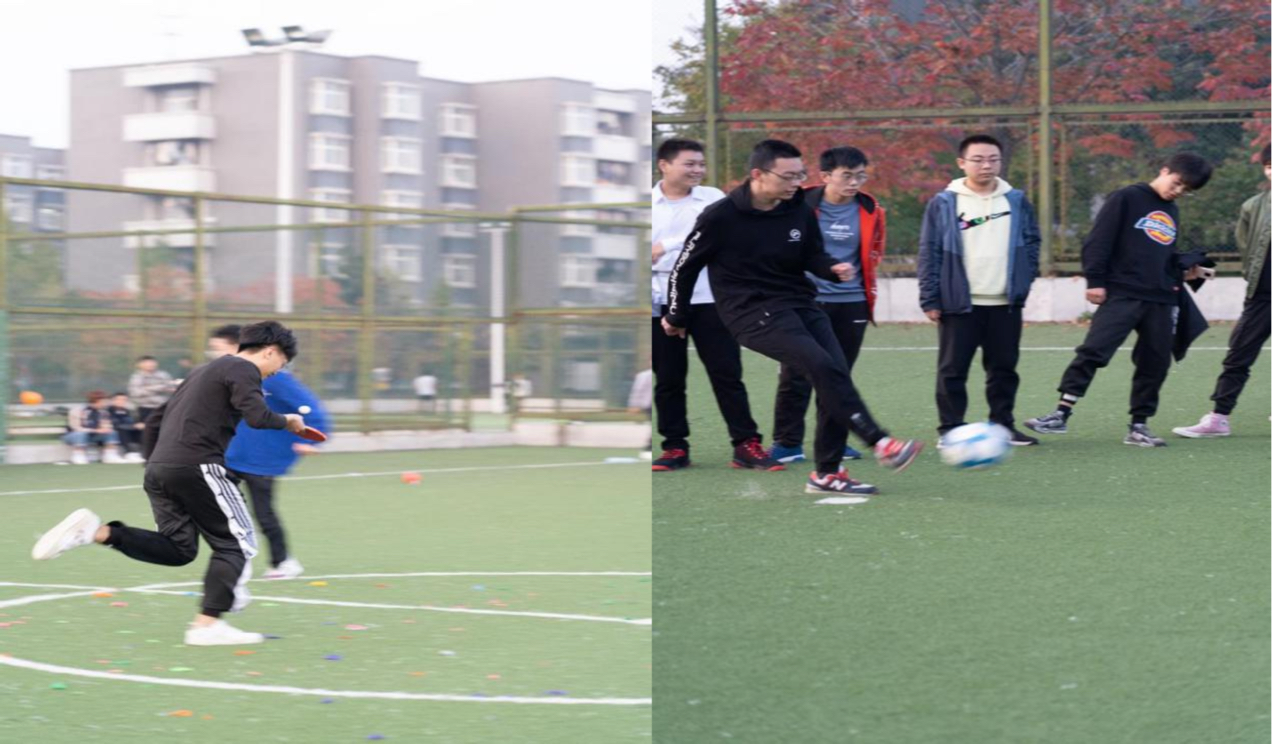 足球保龄球比赛中,10个矿泉水瓶,按三角形排列,选手踢足球击倒尽可能多的水瓶以获得更高的名次。形式新颖,同学们积极参与、跃跃欲试,因方向偏差失分而遗憾,在踢倒多瓶得高分而欢呼,现场很是热闹。