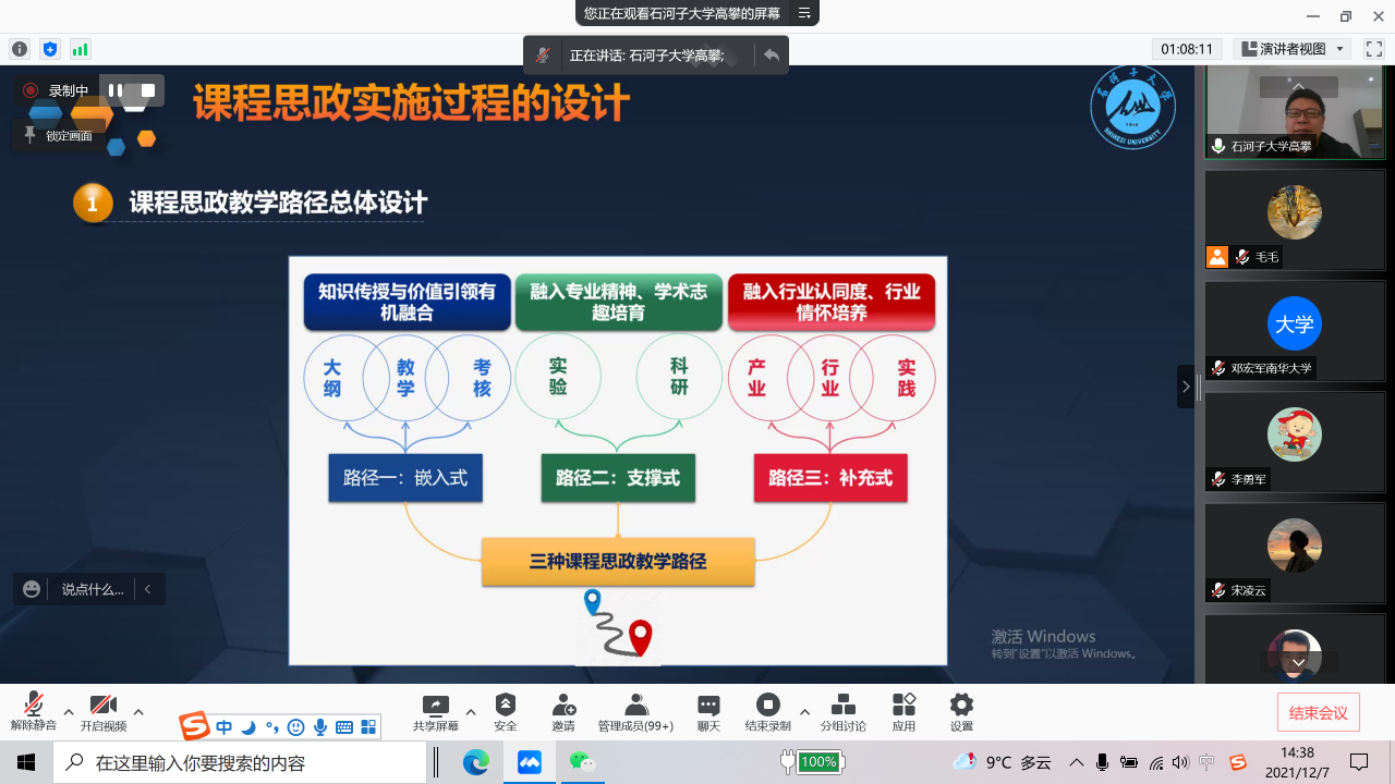 其次,高攀教授从“备课—讲课—反思”三个环节为切入点,强调在课程思政实施过程中,要做到以学生为中心,遵循学生认知规律,按照教学大纲,梳理知识点,精心设计,力求让思政内容入心入脑。对于具体的课程设计过程,高攀教授分享了三条路径。一是嵌入式课程思政教学路径,将社会责任、文化自信、工匠精神等价值理念纳入课程教学所有环节,让专业知识和思政元素有机融合;二是支撑式课程思政教学路径,通过开放学科实验室、学生参与科研项目等学术科研资源来支持思政育人,该方法主要适合培养学生爱国情怀、学术精神;三是补充式课程思政路径,通过联动国内外行业专家和行业的实践资源来补充课程思政教学的不足,该方法有利于培养学生行业认同度和专业精神。