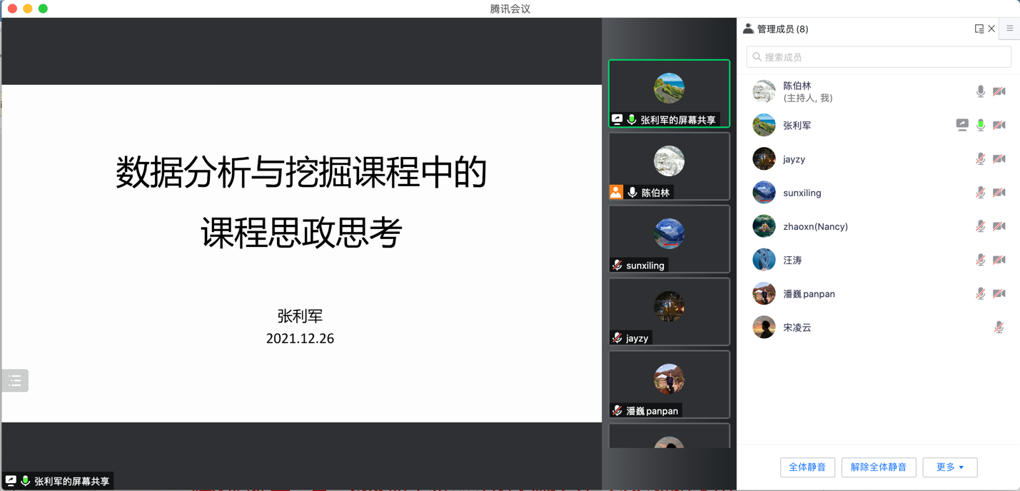 计算机科学与软件系召开“课程思政建设实施方案”第二轮学习研讨会议,系统梳理了《数据科学的数学方法》、《数据分析与挖掘》、《信息存储与管理》这三门课的课程思政建设工作,会议由系支部书记陈伯林主持,数据科学与大数据专业核心课与基础课教师参加了会议。