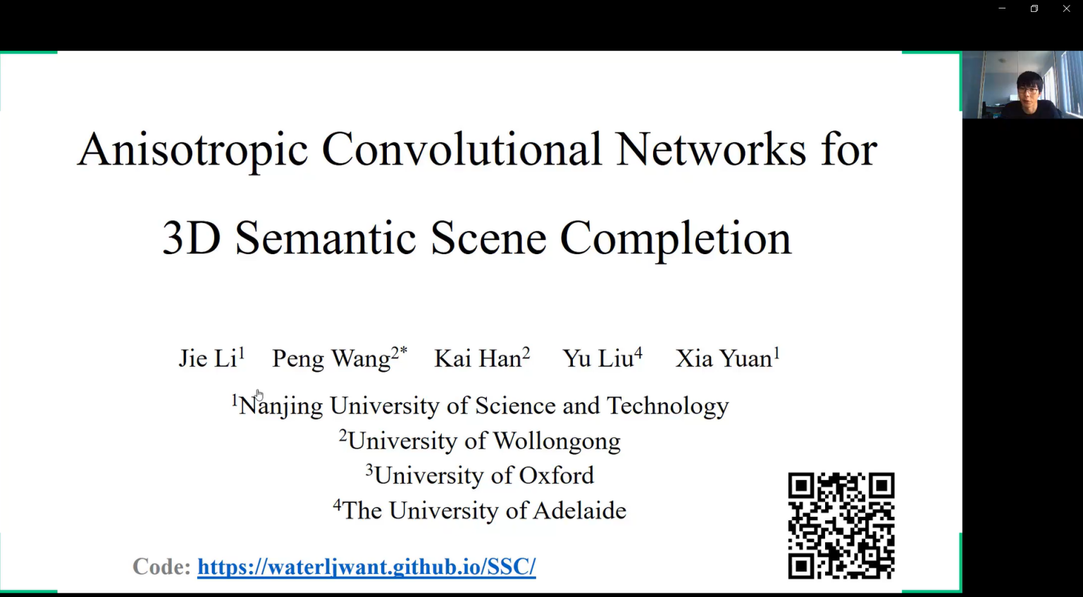 王鹏老师的报告题目为《Anisotropic Convolutional Neural Networks for RGB-D based Semantic Scene Completion》,针对三维语义场景填充应用中,场景复杂导致固定卷积模型导致泛化能力弱、现有参数量大、计算复杂度高等难题,基于低秩张量分解思想,提出了各向异性的动态可分解卷积网络,详细分析了模型提出的动机、模型细节、带来的效果提升以及后续可能的改进方向。
