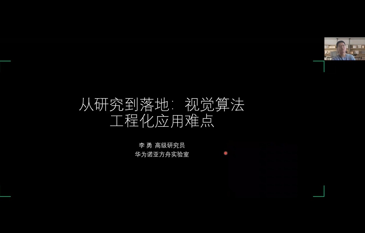 李勇研究员的报告题目为《从研究到落地:视觉算法工程化应用难点》,围绕人工智能和计算机视觉方向,从工业产品生产角度,详细介绍了目前科研成果落地过程在数据、模型、算力、硬件等方面存在的局限性,并介绍了华为诺亚方舟实验室提供的开源数据库、计算框架和部分最新的研究成果。