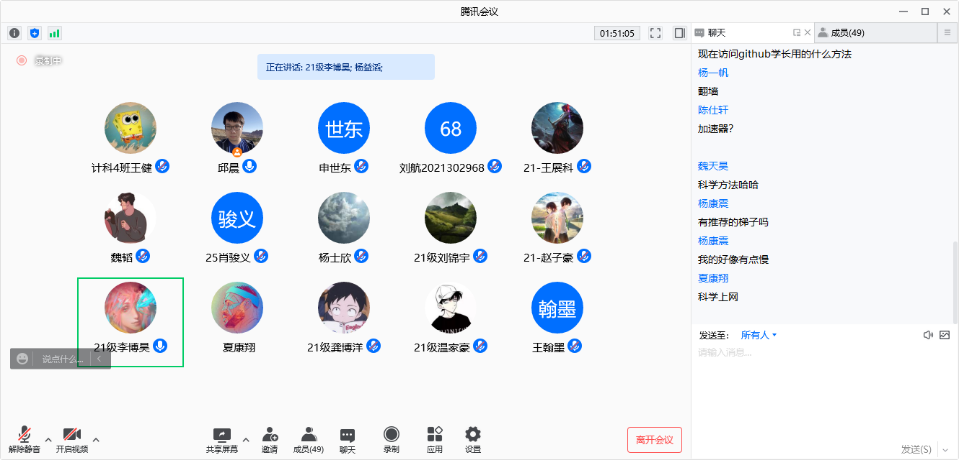 同学们积极互动,提出了许多高质量的问题。21级李博昊同学提出,“由于接触的内容过少,如何找到自己真正感兴趣的计算机方向?”学长给出了数条实用的建议,如利用网站、慕课资源等,并提供了一些自己体验过的优质资源。某些同学由于环境的限制,无法开麦,选择在评论区积极互动交流。