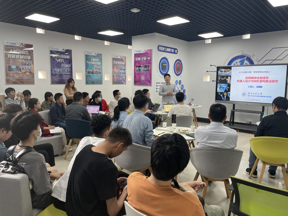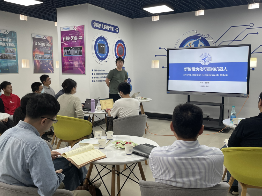 在报告的下半场,博士生吴磊同学作为学生代表,向大家分享个人想法。他从群智模块化可重构机器人方面进行了补充,讲解了模块化可重构机器人的概念和应用,低成本、多功能等特点是模块化可重构机器人的优势。但是万物充满挑战,从生物群智启发方面研究可重构机器人是未来研究的重点任务。