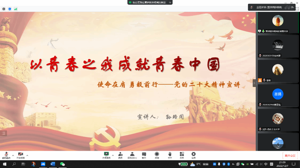 2020级本科生团支部组织了一场主题团日活动,开展了“以青春之我成就青春中国”为题的党的二十大精神宣讲,年级辅导员和2020级青年团员以线上线下相结合的方式聆听了本次宣讲,开展了热烈的讨论。