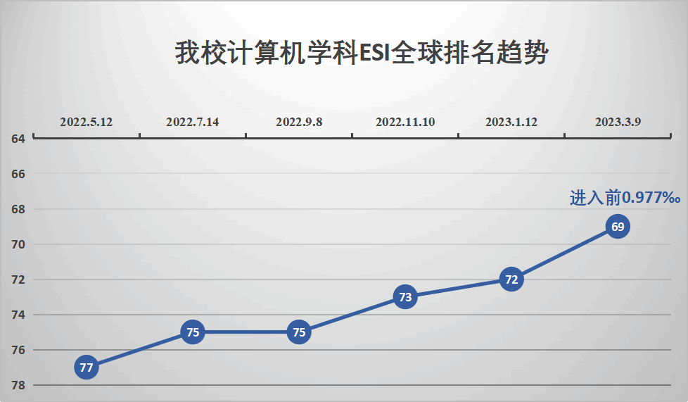 “计算机科学”学科发表 WOS论文共2818篇,总被引频次35129次,以第69名排位,进入全球排名前1‰。这是计算机科学继我校材料科学、工程学之后,第三个进入ESI前1‰的学科。