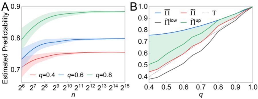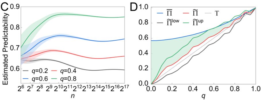 可预测性指给定时间序列的预测准确率极限。探索这样的度量非常重要。一方面,根据给定的数据,它可以用来评估表现,并估计现有算法的潜在改进空间。另一方面,它描述了时间序列的内在规律,从而加深了对相关现象的理解。例如,可预测性变化揭示了灾难后人类移动模式的改变,量化行为相似性和社会关系对人类移动预测的贡献,揭示模型结构和社会网络异质性在预测传染性疾病疫情的预测中所发挥的作用,等等。