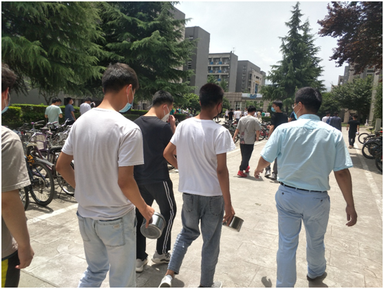 在走访最后一个宿舍时,正好遇到同学们去食堂吃饭,为了不耽误同学们吃饭的时间,万海东副书记和同学们边走边聊。他提醒同学们在食堂就餐应注意单人单桌,尽量自备饭盒,既经济又环保。