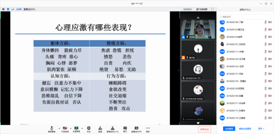 讲座开始,张洪英老师阐述了疫情时期对人们心理的影响,疫情前期至“后疫情“时期,人民群众心理情况的变化。除此之外,张洪英老师还用通俗易懂的方式为我们解释了心理应激反应,让我们了解到应激反应和人喜怒哀乐的情绪变化都是非常正常的行为。