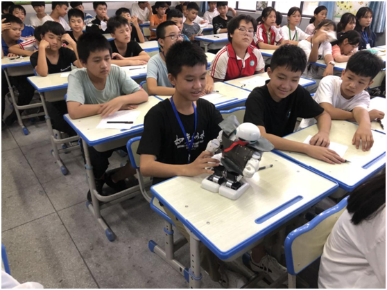 研究生徐晨曦在思源实验学校现场用实物为学生们做智能机器人的科普和展示。徐晨曦同学的研究方向为智能决策与机器人技术,他利用自己的技术特长为学生们现场展示了我校机器人创新实践基地研发的人形智能机器人,从原理、种类、用途等多个方面做了详细的介绍,并解答了同学们的疑问,同学们对此充满好奇,兴趣浓厚。