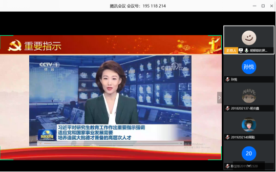 研究生会召开视频会议,深入学习贯彻习近平总书记关于研究生教育的重要指示精神,70余名研究生同学一同开展“全国研究生教育会议”讨论课。会议由院研究生会主席胡银婷、副主席朱佳萍共同主持。