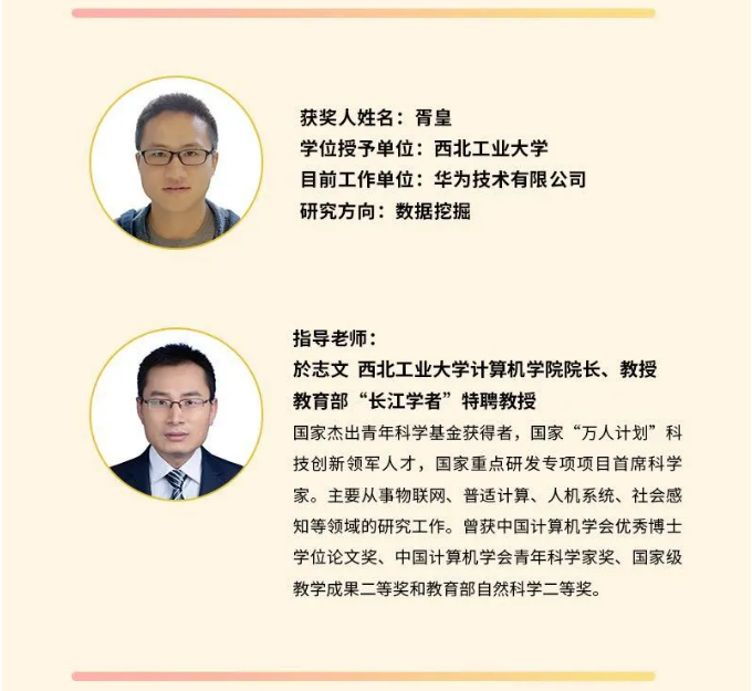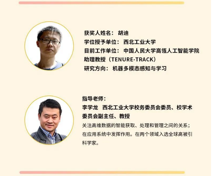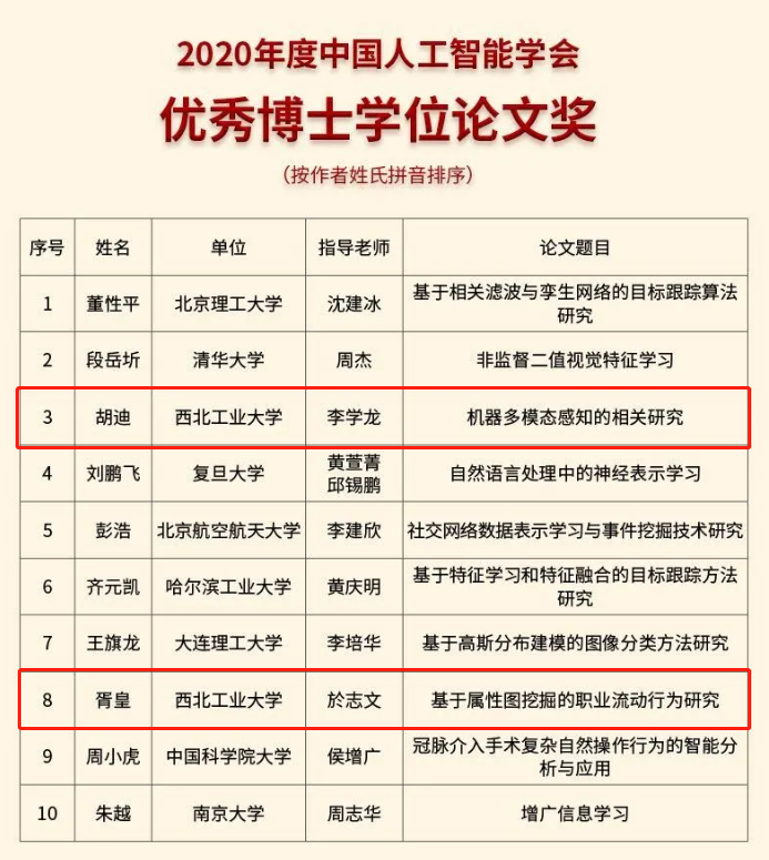 胡迪博士的论文《机器多模态感知的相关研究》、胥皇博士的论文《基于属性图挖掘的职业流动行为研究》被评为2020年度中国人工智能学会的优秀博士学位论文,导师分别为李学龙教授,於志文教授。