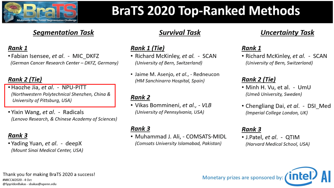 等机构联合主办,自2013年起已连续举办8届。今年的BraTS 2020竞赛规模更大,吸引了七十多家国内外高校和研究机构的参与。在夏勇教授和匹兹堡大学黄恒教授、悉尼大学蔡卫东副教授的联合指导下,我校博士生贾灏哲同学提出高分辨率和非局部特征学习网络,利用平行多尺度融合模块来增强网络的高分辨率特征学习能力,同时引入期望最大注意力模块,高效低成本地增强模型提取影像中全局依赖性信息的能力,进而提高模型的分割准确率,并最终获得该竞赛第二名。
