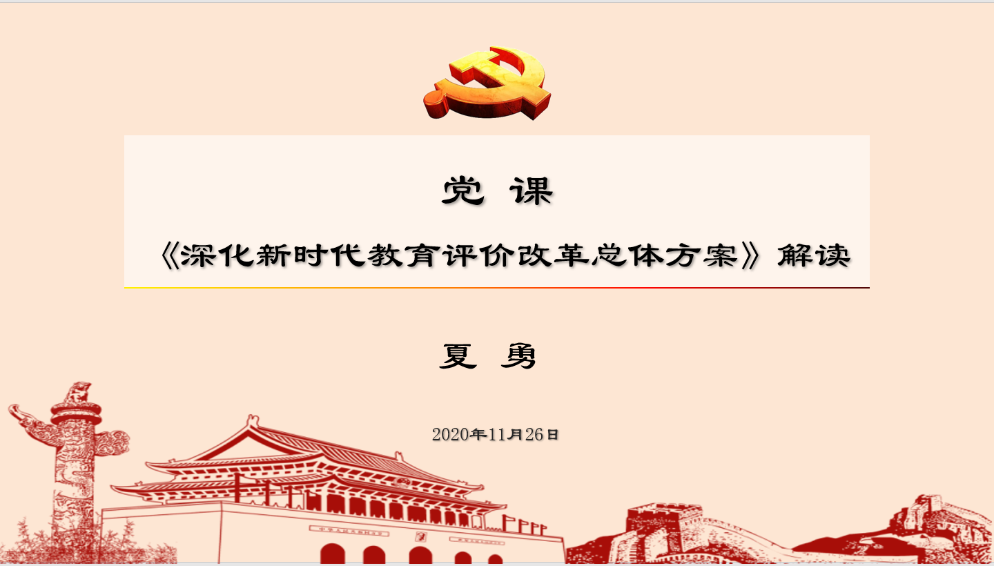 副院长夏勇讲授参加一系第二党支部党员大会并为全体党员讲授主题为“《深化新时代教育评价改革总体方案》解读”党课。夏勇副院长首先对相关文件进行了说明和介绍,然后结合自己在研究生教育培养中的真实案例对《深化新时代教育评价改革总体方案》进行了解读。从目前教育评价中存在的问题出发,剖析各种评价指标的优劣,指出了教育评价改革的重要性和迫切性。