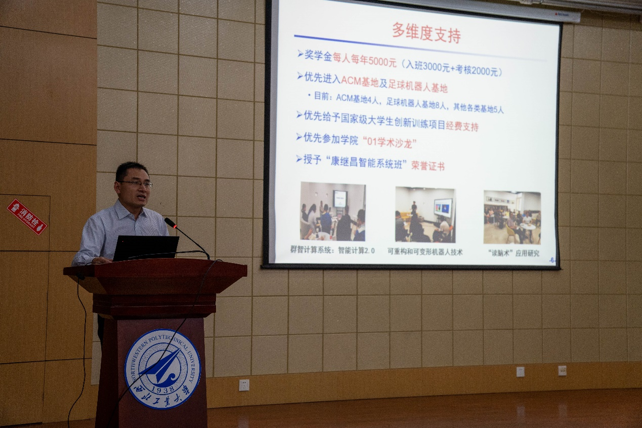 院长、首届“康继昌智能系统班”班主任於志文为大家介绍班级总体情况。於志文从培养目标及特色、“康班一期”取得的优异成绩、未来选拔及考核三个方面为大家详细介绍了“康班”总体情况。近一年来,首届康班学生在学风建设、学科竞赛、创新创业训练等取得突出成绩,於院长勉励同学们再接再厉,并欢迎有志于计算机系统能力发展的优秀学生报名加入这个卓越的集体。